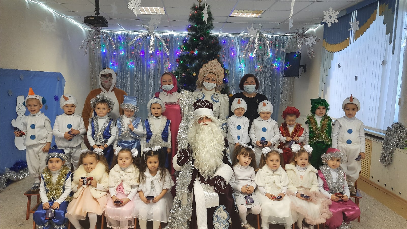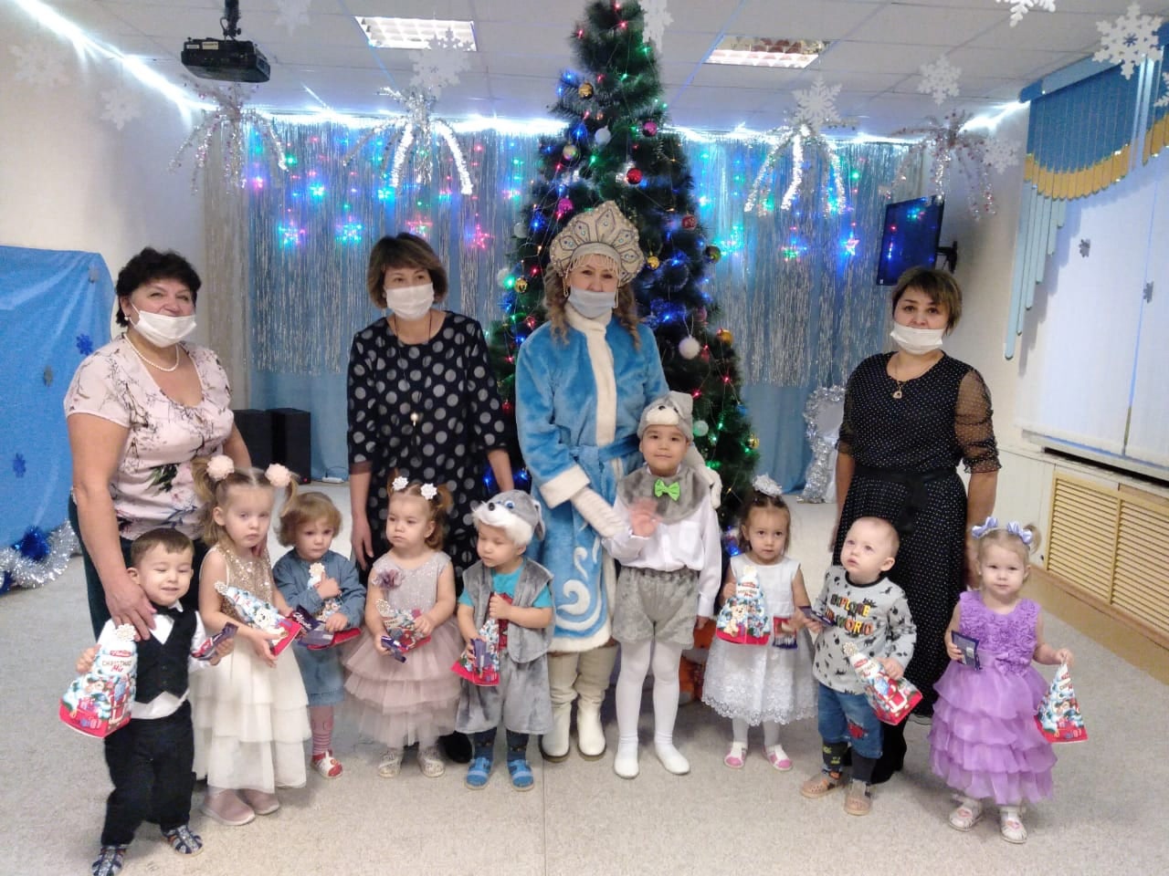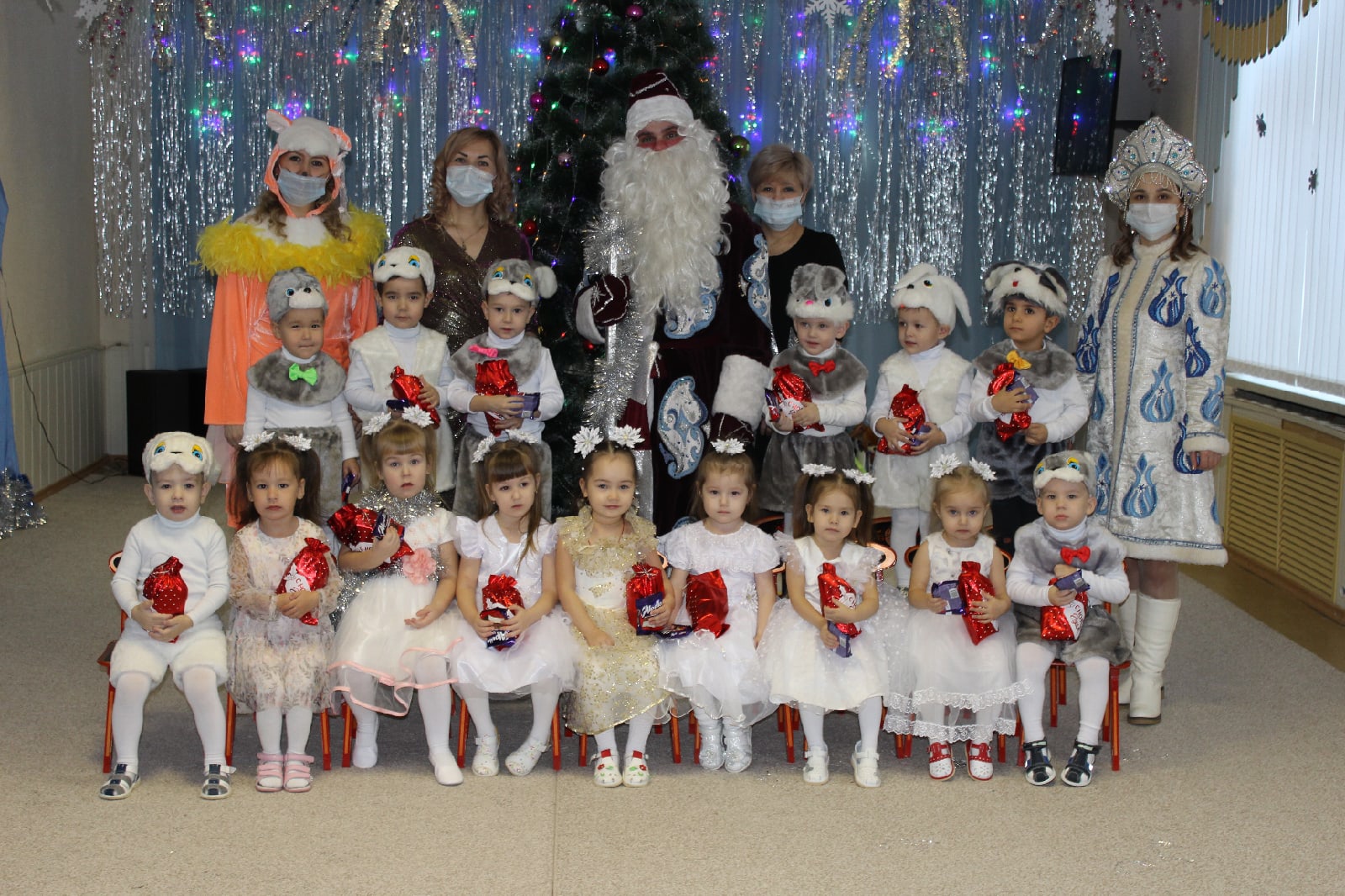 Новый Год - это самый волшебный, веселый праздник, которого дети ждут, веря в сказку и чудо… С 24 по 30 декабря в нашем детском саду прошли новогодние утренники. Красиво украшенный зал, нарядная елка, подарки, Дед Мороз и Снегурочка, Кощей и Баба Яга, Лисичка, персонажи мультфильма "Мадагаскар" ожидали детей дошкольного учреждения. Ребята погрузились в мир чудес, приключений, невероятных превращений и сюрпризов. Дошколята танцевали, пели песни, читали стихотворения, водили хороводы, с удовольствием участвовали в играх и конкурсах. Дети получили массу положительных эмоций и долгожданные подарки из рук Деда Мороза.