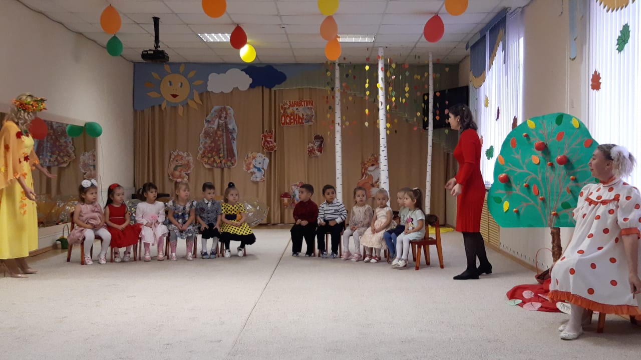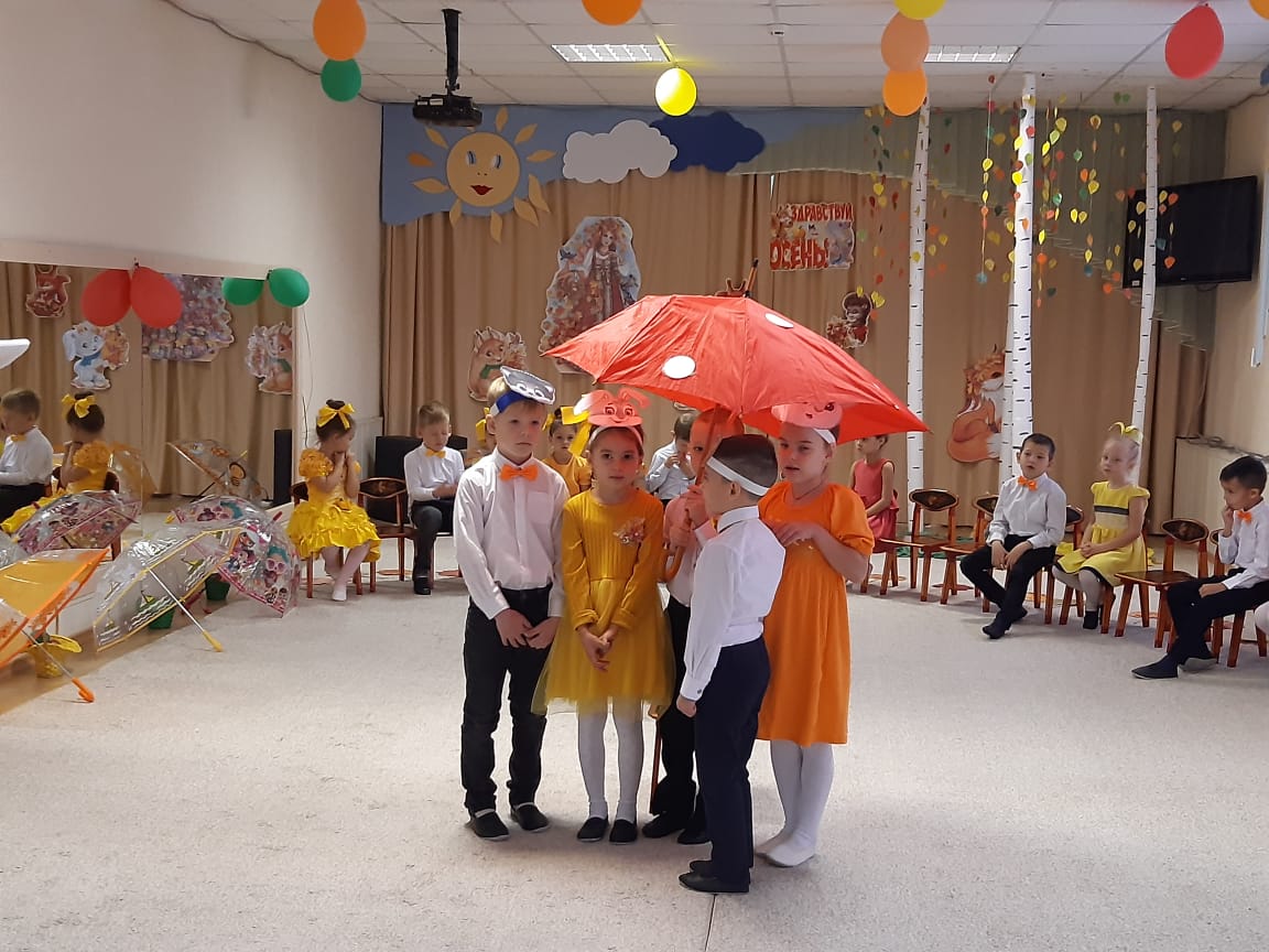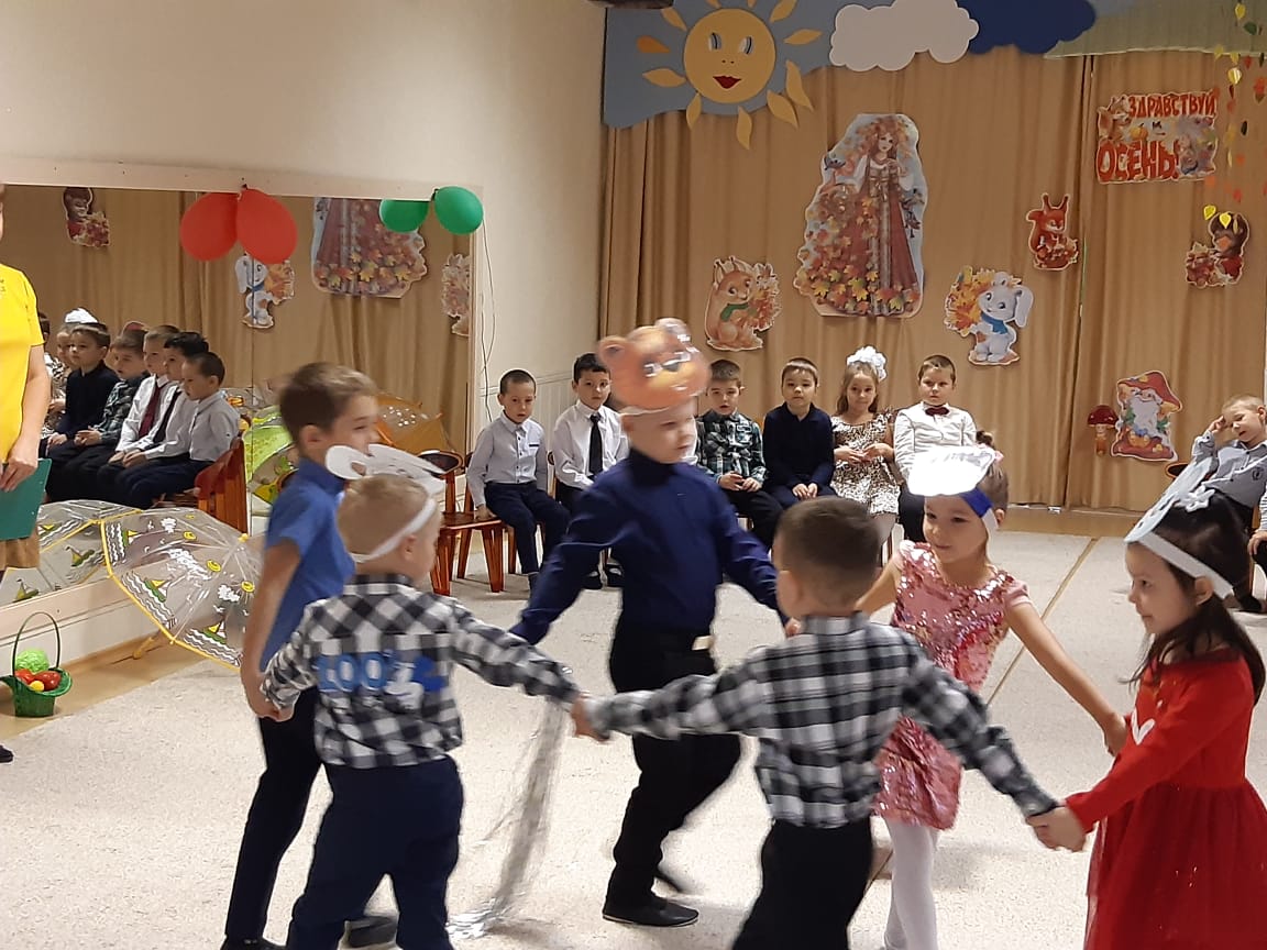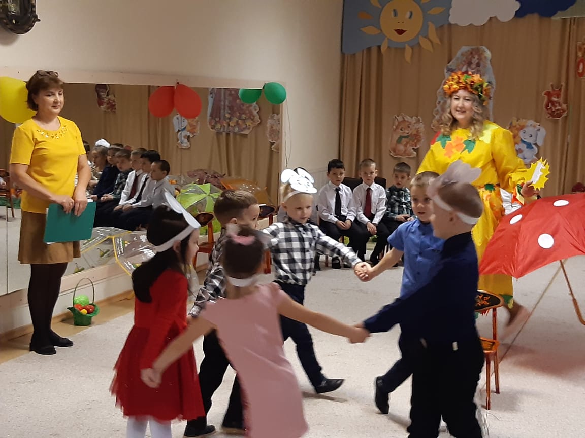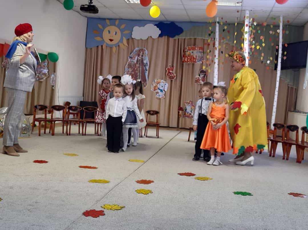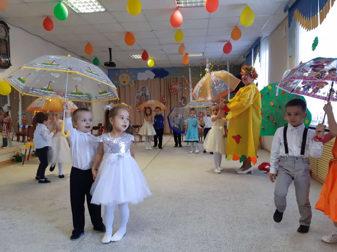 В младших группах ребята танцевали с осенними листочками, пели песни, играли в игры. В средние группы приходила Осень и ворона Каракара, которая принесла волшебный зонтик и поиграла с ребятами в увлекательную игру. Детям доставило это удовольствие и праздничное настроение
