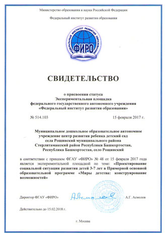 Муниципальному дошкольному образовательному автономному учреждению центр развития ребенка детский сад с.Рощинский в соответствии с приказом ФГАУ «ФИРО» №48 от 15.02.2017г. присвоен статус экспериментальной площадки федерального автономного государственного учреждения «Федеральный институт развития образования».