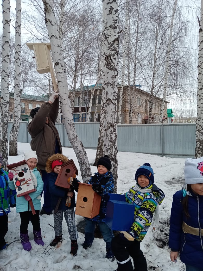 В каком восторге были наши дети, когда с гордостью приносили в группу «птичьи домики», сделанные заботливыми руками родителей. Все скворечники были размещены на территории детского сада.